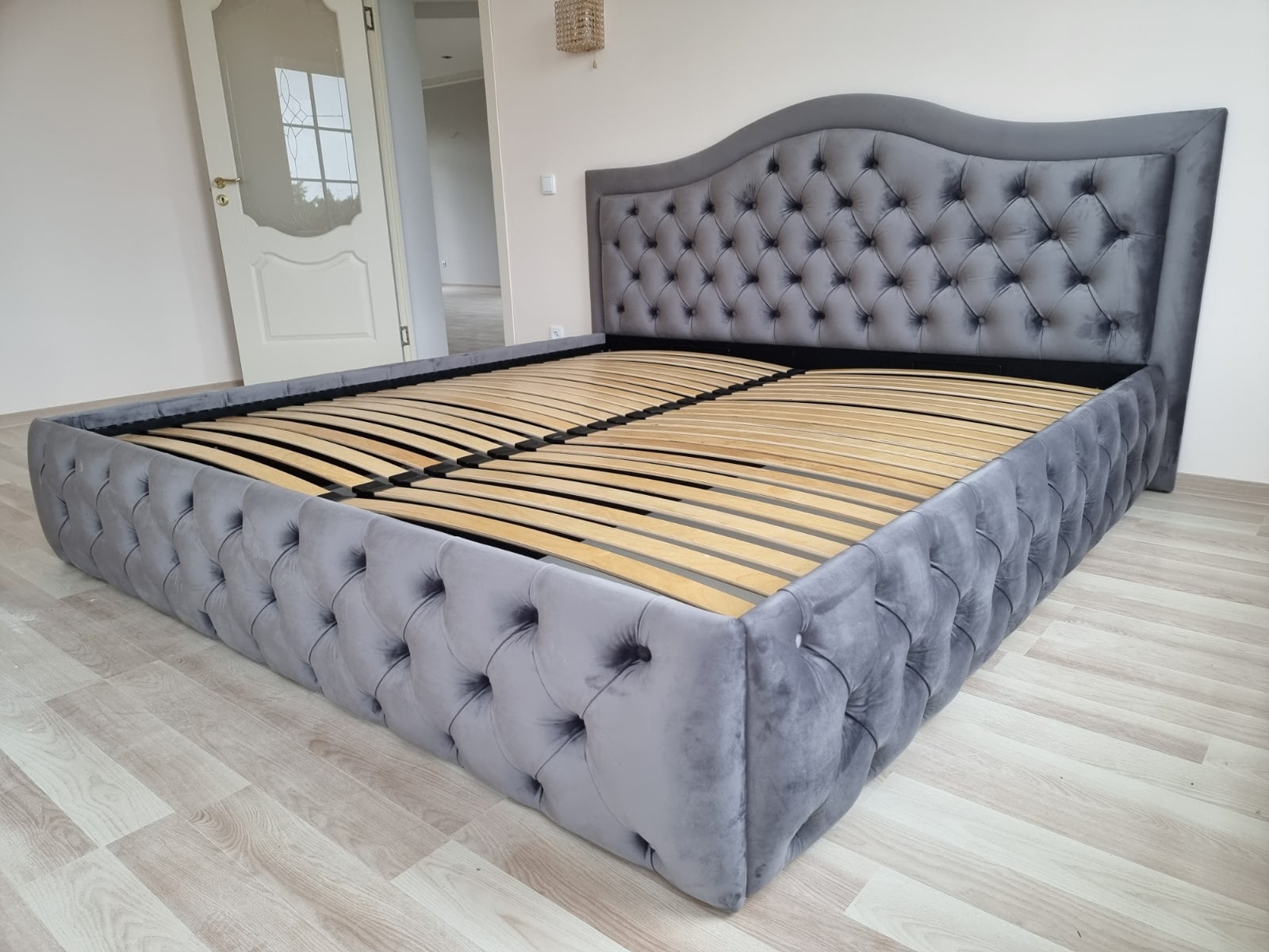 Tai modernaus dizaino, veliūru aptraukta dvigulė lova su patogiu pakeliamu grotelių mechanizmu ir erdvia patalynės dėže.