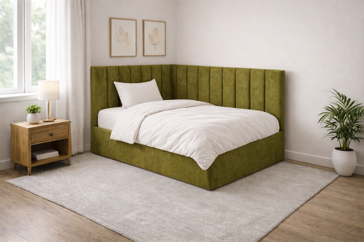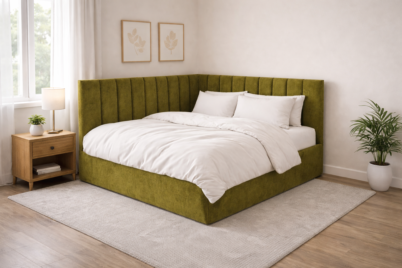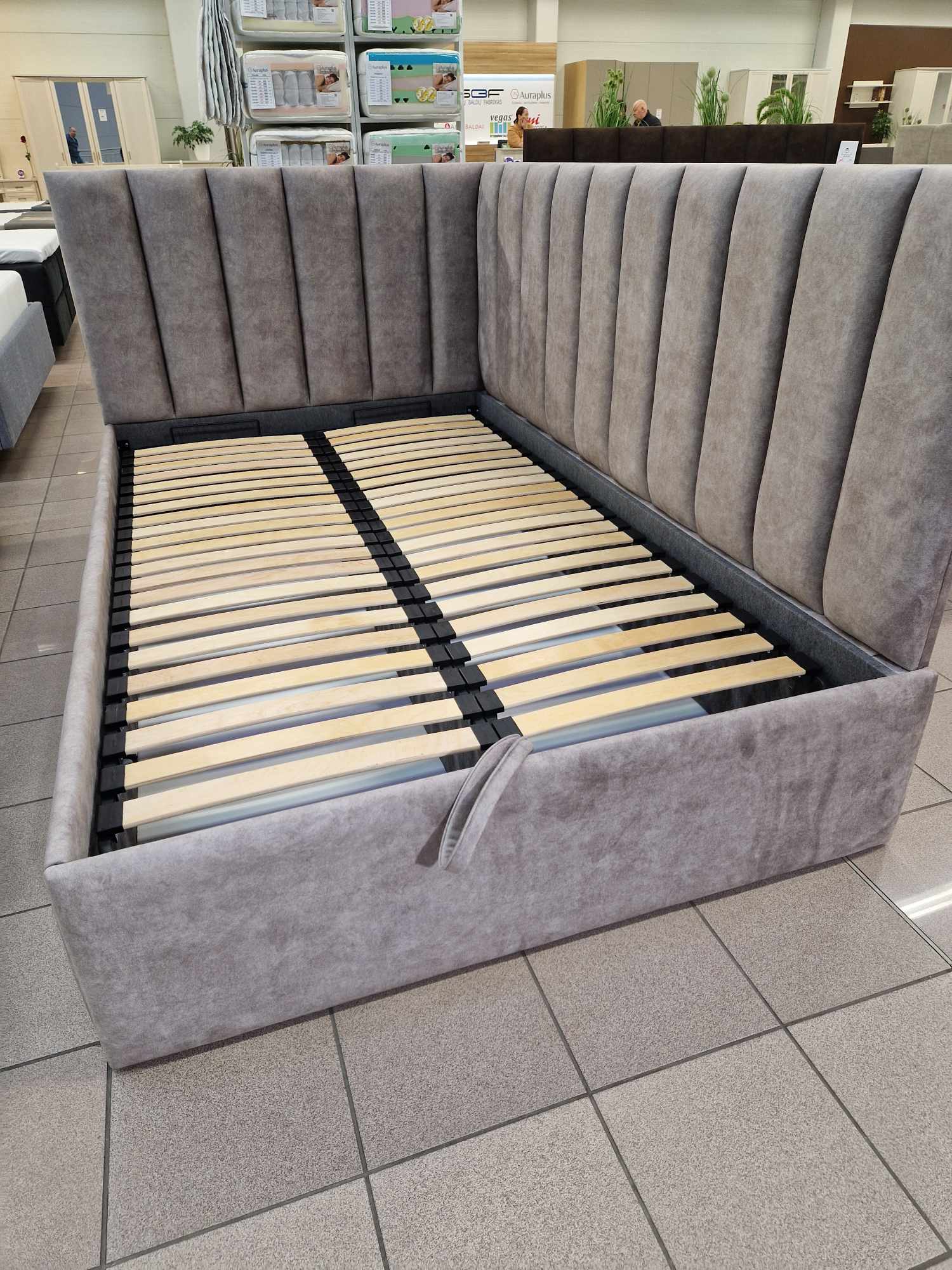 Tai modernaus dizaino, veliūru aptraukta kampinė lova su patogiu pakeliamu grotelių mechanizmu ir erdvia patalynės dėže.