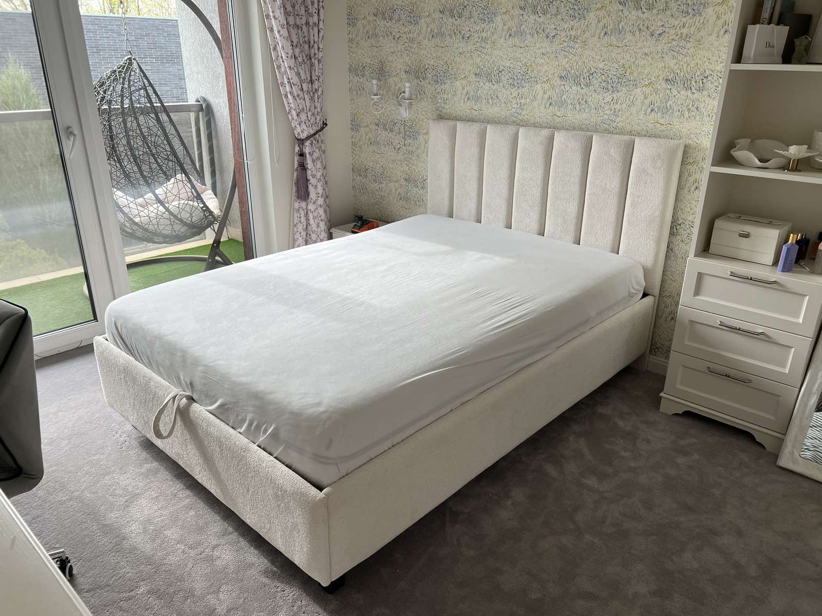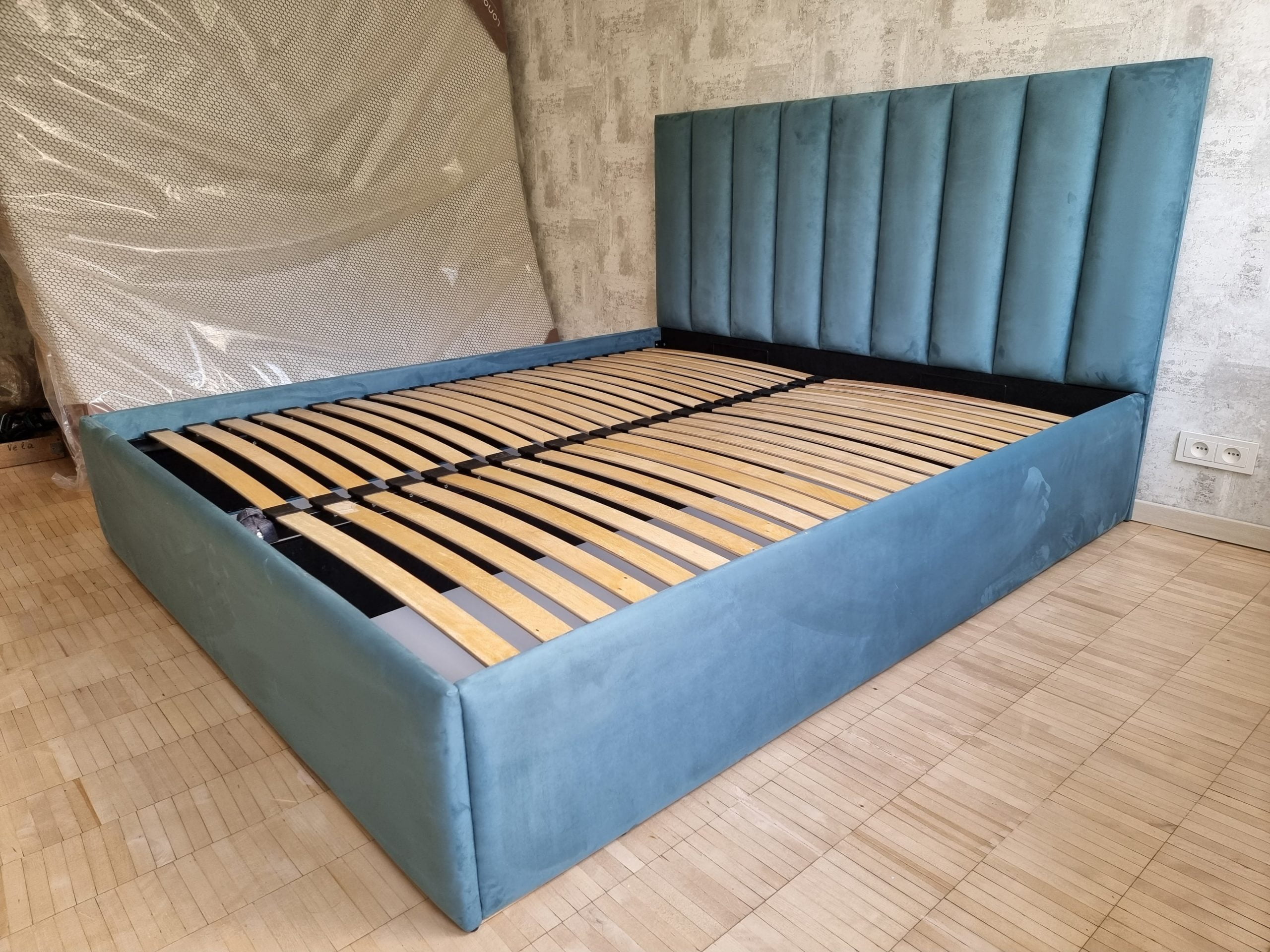 Tai modernaus dizaino, veliūru aptraukta dvigulė lova su patogiu pakeliamu grotelių mechanizmu ir erdvia patalynės dėže.