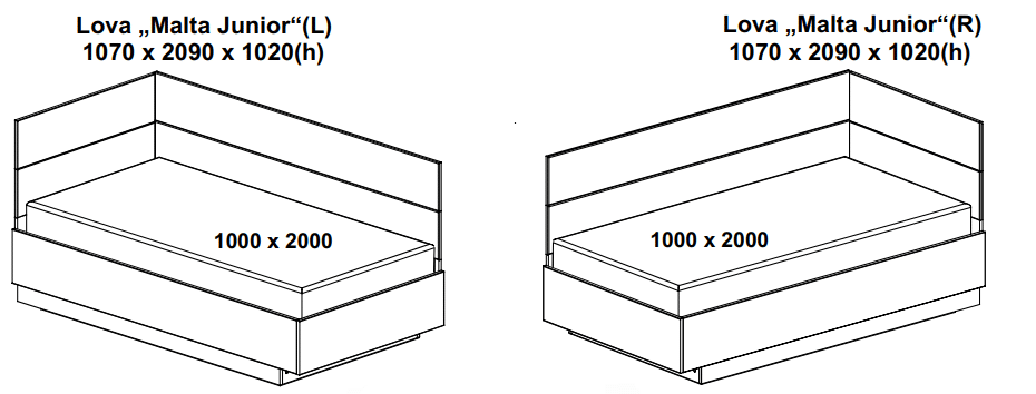 Lova JUNIOR – minimalistinis ir ergonomiškas modelis, su plonu galvugaliu ir šonine sienele, taupantiems erdvę. Korpusas pagamintas iš kokybiškos LMDP plokštės.