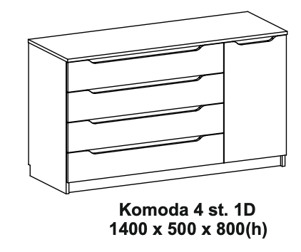 Baldas Plotis, cm Gylis, cm Aukštis, cm Komoda 4st/1d 140 50 80 Komoda 4st/2d 160 50 80 - Gamybos terminas 2 – 8 savaitės