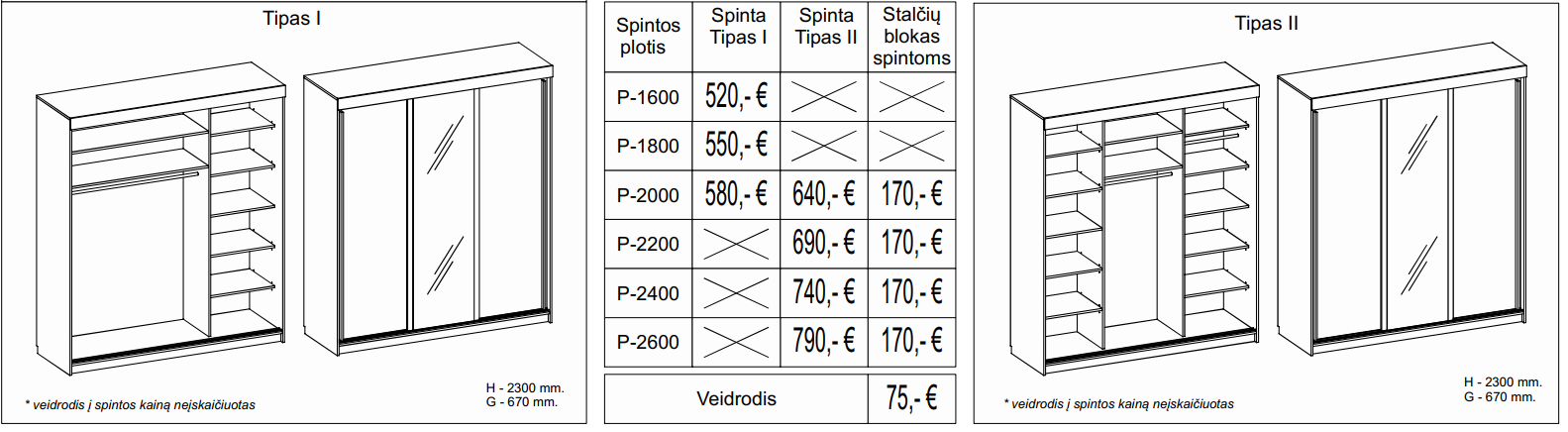 Priklausomai nuo spintos ilgio, gaminame I tipo (1 lentynų blokas) ir II tipo (2 lentynų blokai) žr. galeriją.
