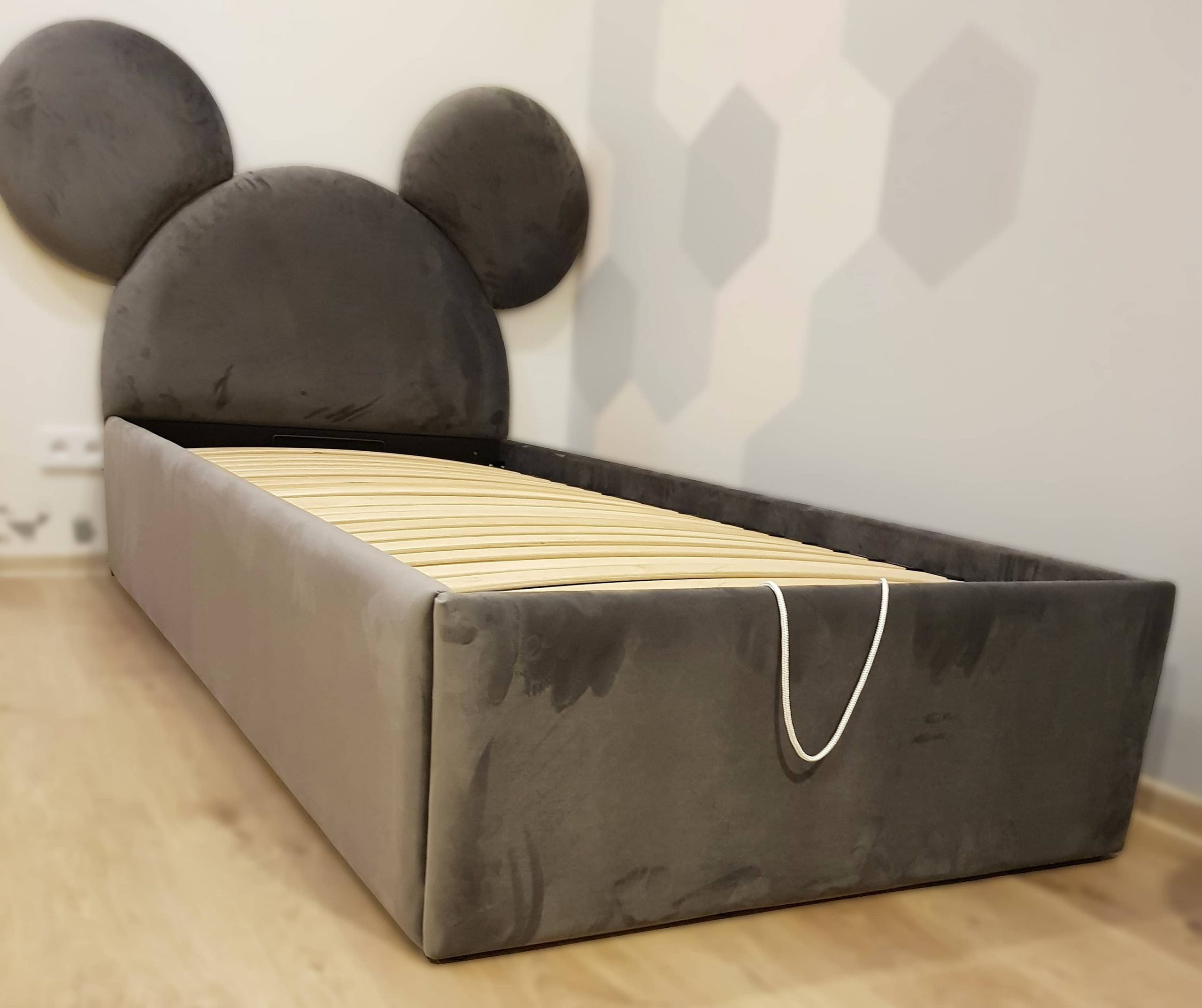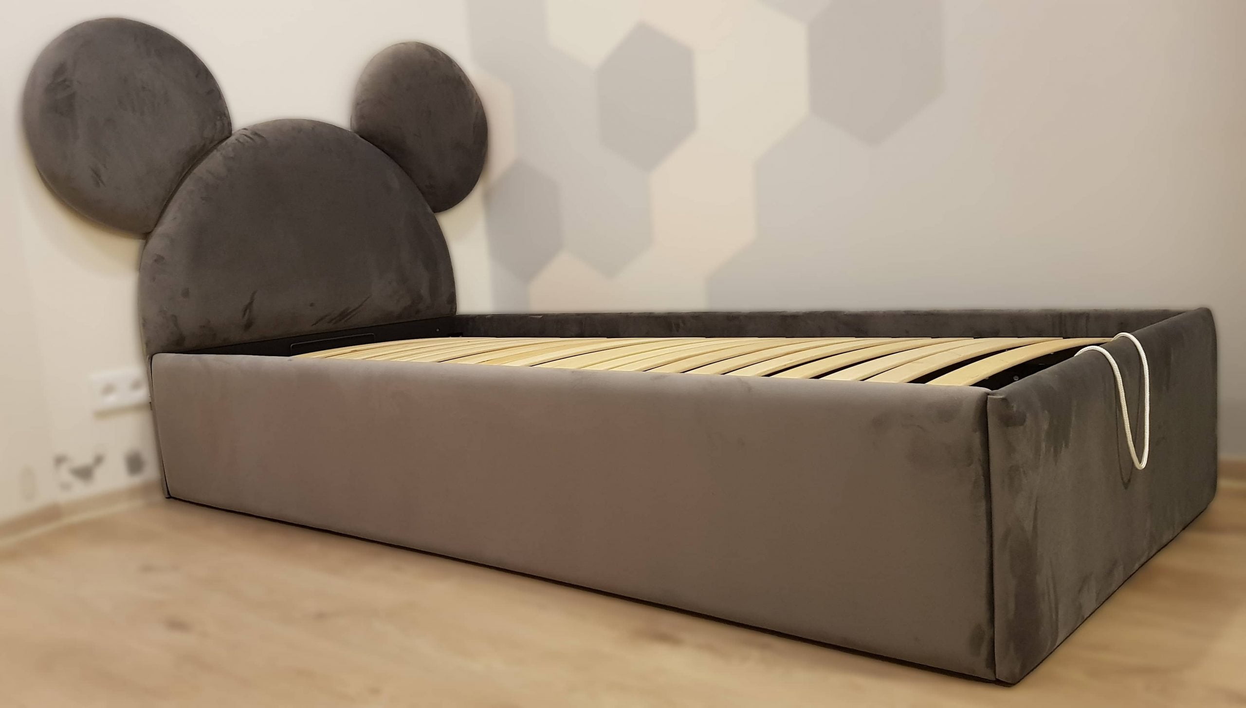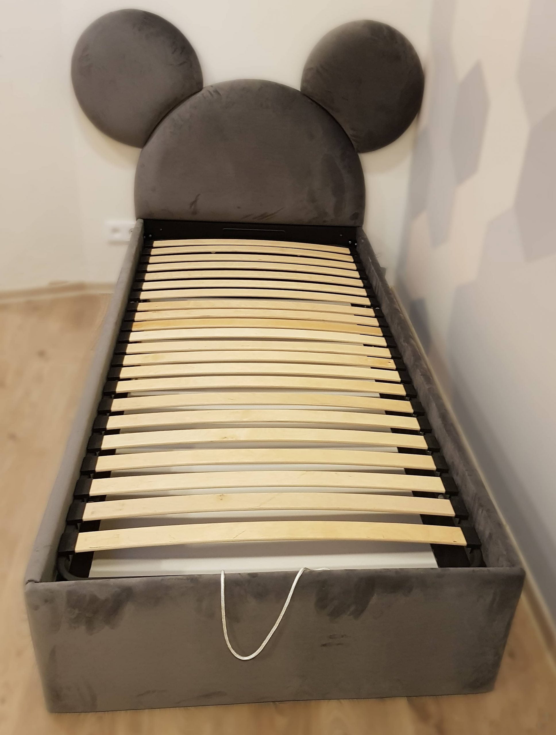 Stilinga ir žaisminga, veliūru aptraukta dvigulė lova su patogiu pakeliamu grotelių mechanizmu ir erdvia patalynės dėže.