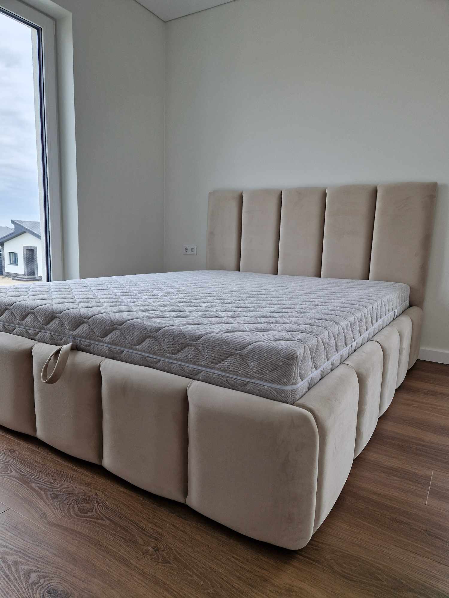 Tai modernaus dizaino, veliūru aptraukta dvigulė lova su patogiu pakeliamu grotelių mechanizmu ir erdvia patalynės dėže.